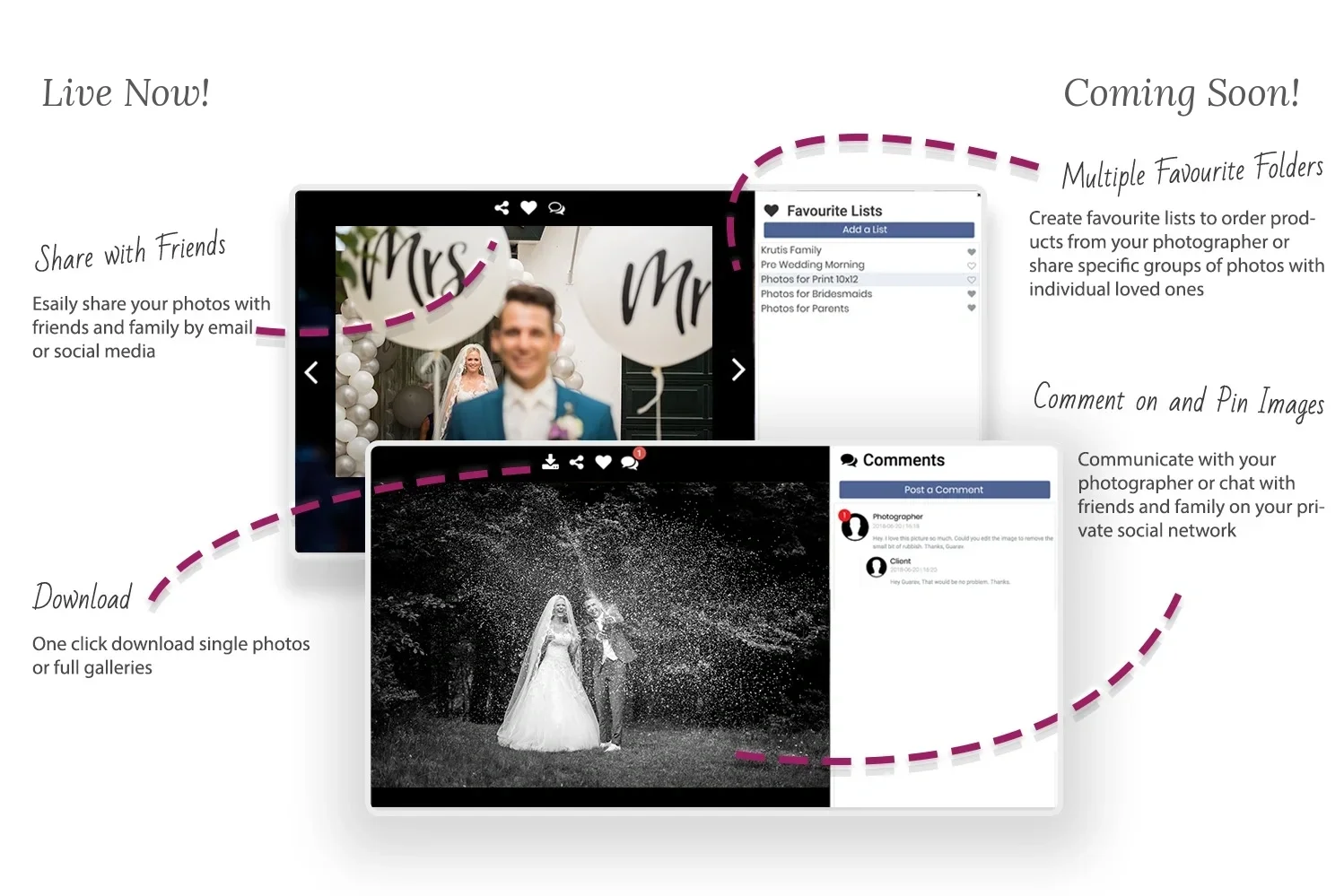 Sign up for your free account today to try out our service. With a free account you can store your photos from any device, receive and download a PRO gallery from any professional photographer and upload photos to a shared event.